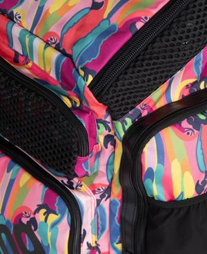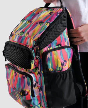 Organize all the stuff you need for training. The large and ultra stylish arena One Go Backpack Allover 45L, featuring a top-loading design, allows for effortless packing and access to your belongings. The roomy main compartment and four external zipped front pockets provide multiple storage options. Breathable and watertight inserts keep wet and dry items separate. It includes a smart laptop sleeve and two external bottle pockets. Aquabreathe, arena's new wet management system, combines breathable and water-repellent fabrics to create an advanced ventilation system that keeps water out and your gear dry. The breathable back panel ensures sweat-free transport. A practical belt allows for easy attachment to a suitcase, while the included carabiner makes hanging the backpack convenient. The water-repellent bottom and main fabric offer reliable protection from moisture and dirt.
