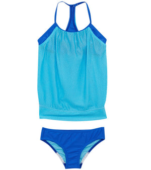 Whether she's busy cannonballing in a pool or building sand castles, she needs a swimsuit that can keep up. Enter this durable tankini, with its roomy blouson tank top and classic bikini bottom. Designed with active kids in mind, this set features stay-put straps and silicone grips to ensure the suit remains in place as she plays.