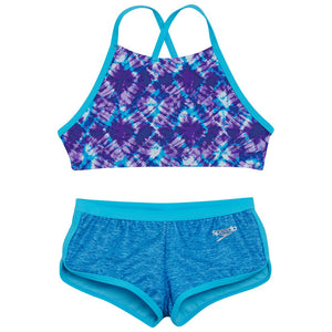 Fun in the sun awaits. She'll love swiming in this durable two-piece set, featuring a tie-dye crop top with a high neckline and crisscross straps that stay in place. A matching boyshort completes the sporty look.