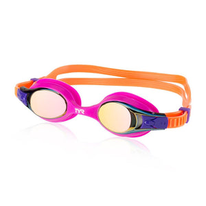The TYR Swimple Metallized Goggle is the perfect swim goggle for smaller faces. With the TYR Swimple Goggle you will no longer have to spend time and energy fitting swim goggles on your kids! The TYR Swimple youth swim goggle is exactly what the name implies: SIMPLE! The headstrap on this youth goggle adjusts by merely pressing down on the release button, holding down and pulling the strap through until you find the perfect fit. The small uni-body frame is made specifically for children, requiring no adjustment around the eyes. The TYR Swimple Metallized goggle has mirrored lenses that reflect the bright glare from the sun, making this a great swim goggle for the outdoors. Great colors and great fit make the TYR Swimple Metallized Goggle one of our most popular youth swim goggles!