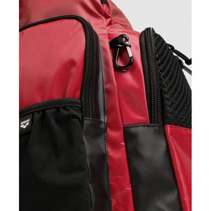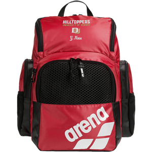 Organize all the stuff you need for training. The large arena One Go Backpack 45L, featuring a top-loading design, allows for effortless packing and access to your belongings. The roomy main compartment and four external zipped front pockets provide multiple storage options. Breathable and watertight inserts keep wet and dry items separate. It includes a smart laptop sleeve and two external bottle pockets.