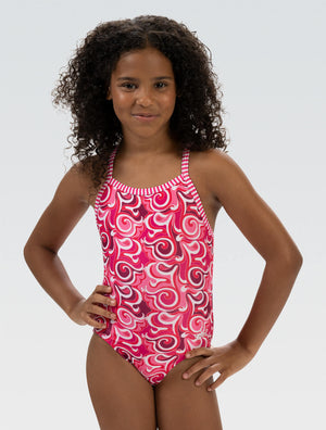 Let your active youngster stay in motion in this cute Cascade print one piece training suit for girls! Fully lined in violet coloring to match the wavy pinks and purples, this is a happy and snappy practice suit that she is sure to love!