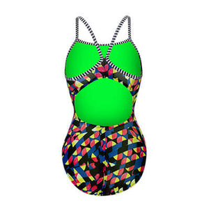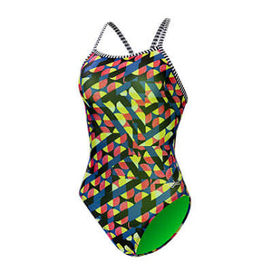 Fully lined in lively lime coloring, this swimsuit is designed with comfort and fit in mind. The chlorine resistant fabric ensures durability, while shape retention and UPF 50+ sun protection for your outdoor swims. The V-back style with an open keyhole back detail and a performance leg cut make for a look that’s unique as you are.