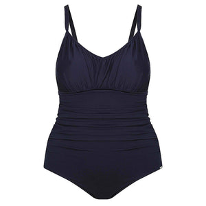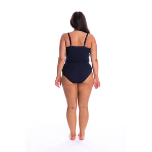 This lovely Honeycomb Underwire One Piece Swimwear is a gorgeous one piece swimsuit available in a gorgeous navy blue and in our chic honey comb textured fabric. The fabric is textured for a stylistic trend and gives a fun twist to regular one piece swimwear fabric. This plus size one piece swimwear is a perfect addition for any woman looking for more tummy coverage without compromising showing off your neckline or legs, and while staying in style this summer.
