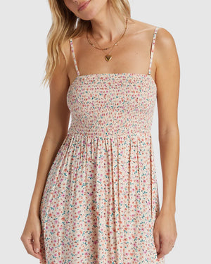 Effortless summer style, courtesy of Billabong Women's Off The Coast midi dress. Crafted from soft, breathable cotton double gauze, this breezy staple features a flattering fitted bodice with straight neckline and smocked detailing, plus a flowy, easy-to-move-in skirt for sunny beach-to-brunch days. Quintessential warm-weather versatility.