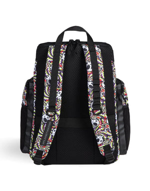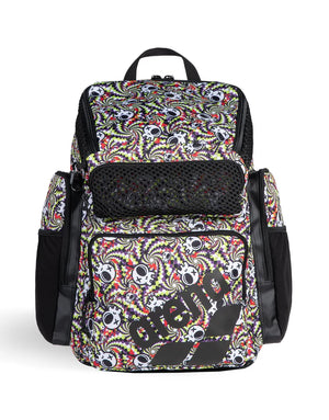 The Fun Skulls One Go 45L Backpack from Arena is designed with fun skull prints all over. Featuring a roomy and moisture-controlled main compartment and four zipped exterior pockets, the backpack is perfect for swimmers for effortless packing and access to your belongings, and the water-repellent fabric ensures important gear and belongings dry and organised. The padded straps, a trolley sleeve, and touch tech fabric make it travel-friendly.