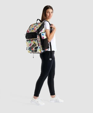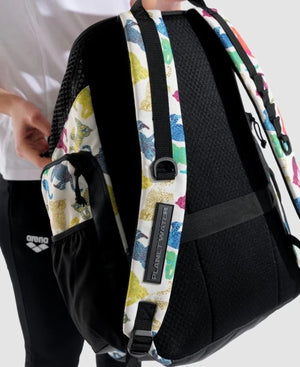 Organize all the stuff you need for training. The large and ultra stylish arena One Go Backpack Allover 45L, featuring a top-loading design, allows for effortless packing and access to your belongings. The roomy main compartment and four external zipped front pockets provide multiple storage options. Breathable and watertight inserts keep wet and dry items separate. It includes a smart laptop sleeve and two external bottle pockets. Aquabreathe, arena's new wet management system, combines breathable and water-repellent fabrics to create an advanced ventilation system that keeps water out and your gear dry. The breathable back panel ensures sweat-free transport. A practical belt allows for easy attachment to a suitcase, while the included carabiner makes hanging the backpack convenient. The water-repellent bottom and main fabric offer reliable protection from moisture and dirt.