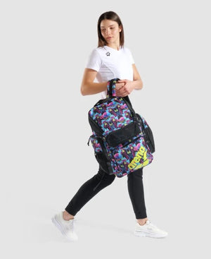 Organize all the stuff you need for training. The large and ultra stylish arena One Go Backpack Allover 45L, featuring a top-loading design, allows for effortless packing and access to your belongings. The roomy main compartment and four external zipped front pockets provide multiple storage options. Breathable and watertight inserts keep wet and dry items separate. It includes a smart laptop sleeve and two external bottle pockets. Aquabreathe, arena's new wet management system, combines breathable and water-repellent fabrics to create an advanced ventilation system that keeps water out and your gear dry. The breathable back panel ensures sweat-free transport. A practical belt allows for easy attachment to a suitcase, while the included carabiner makes hanging the backpack convenient. The water-repellent bottom and main fabric offer reliable protection from moisture and dirt.