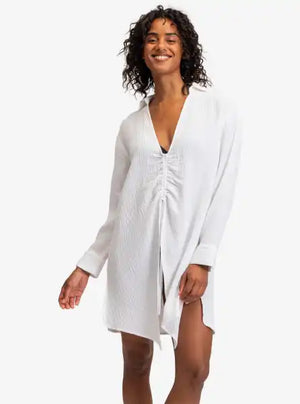 Elevate your summer style with ROXY's Summer Limonade Dress. Crafted in double-layered cotton for a breezy look and feel, this swim cover-up features long sleeves, a deep V-neck with drawstring closure, a side slits for easy movement.