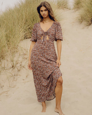 Float through your day in this flowy maxi dress. The fit & flare silhouette flatters your curves, while romantic 3/4 puff sleeves and a tie front add feminine charm. Crafted from soft viscose moss crepe, it's perfect for day-to-night versatility.