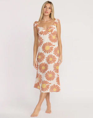 Our breezy cotton-linen midi dress brings easy style with small puff sleeves and a flattering v-neck. Back waist ties create the perfect fit, while the metal plate adds a subtle finishing touch. Featured here in the White colorway.