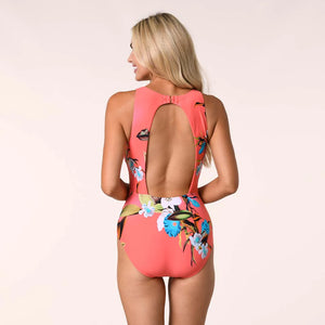 The Botanical Beauty High Neck One Piece features a high neck design for a classic look. Sewn-in cups are included to supply shape and a beautiful portrait back. Suit also has tummy control that is comfortable and helps to smooth!